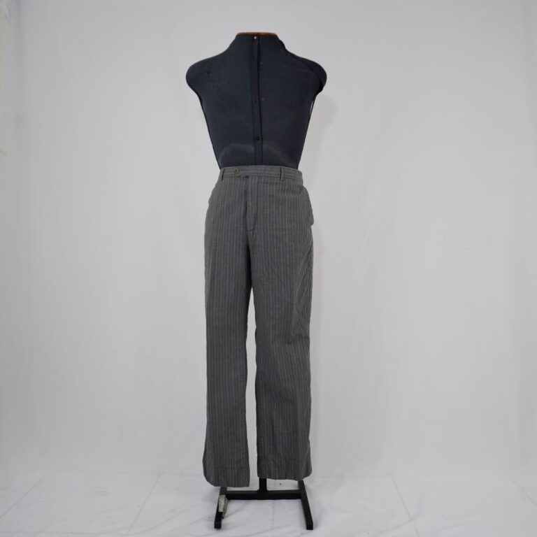 by Michelle Araujo Leia Mais...Calça alfaiataria cinza com linhas brancas e azuis, fechamento em botão de plástico, dois bolsos frontais e dois bolsos na parte de trás com fechamento em botão