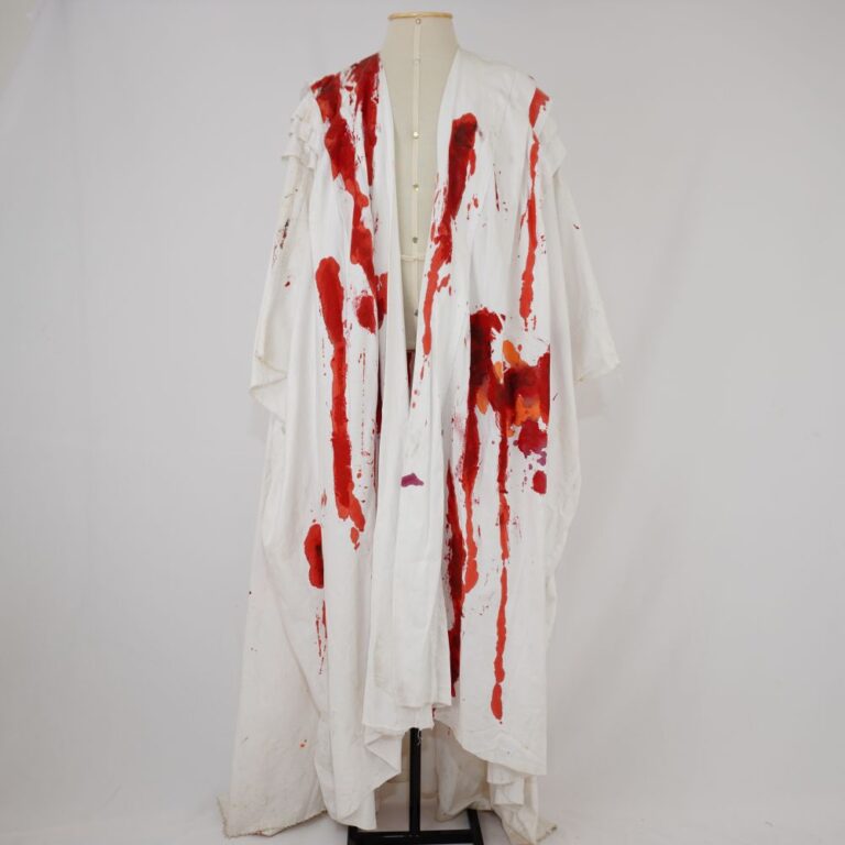 by Michelle Araujo Leia Mais...Túnica ampla, modelagem quadrada branca, com quatro pregas na frente e nas costas, com pintura em laranja, vermelho e bordô
