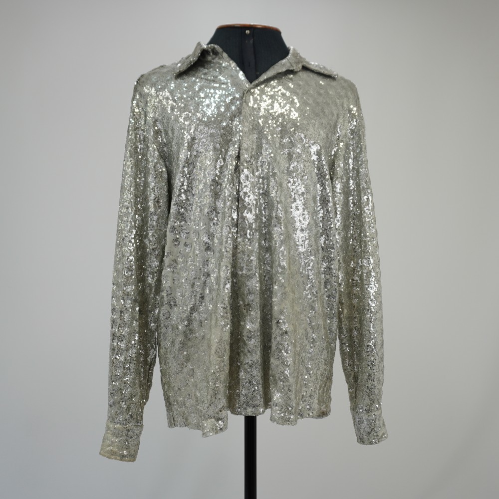 by Michelle Araujo Leia Mais...Camisa de manga longa de paetê prata com desenhos em círculos. Fechamento com sete botões de pressão.