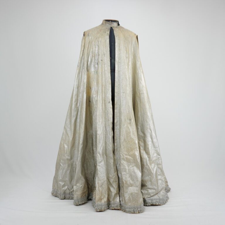 by Michelle Araujo Leia Mais...Capa godê prata com gola padre, fechamento de velcro, cortes laterais para os braços e acabamento na barra com passamanaria prata com franjas