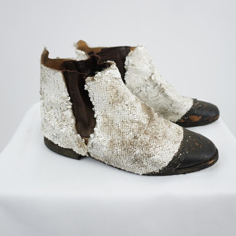 by Michelle Araujo Leia Mais...Bota chelsea preta cano baixo com lantejoulas brancas coladas no couro, solado de madeira