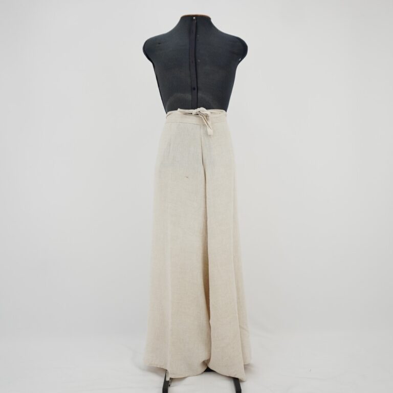 Calça envelope creme com amarração na cintura e barra arredondada