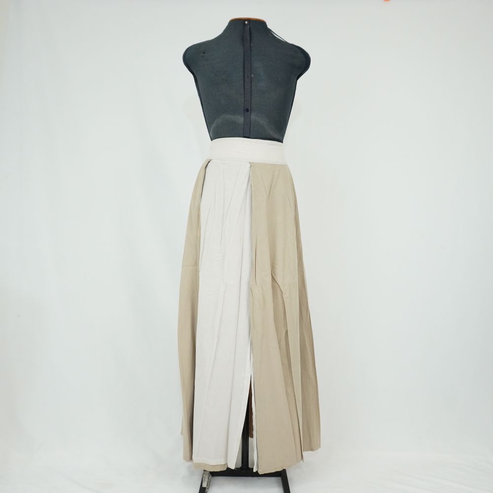 by Michelle Araujo Leia Mais...Saia branca/offwhite e bege, feita de faixas verticais largas fixadas no cós, com fechamento por colchete e botões