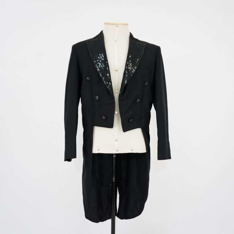 by Michelle Araujo Leia Mais...Fraque preto forrado. Lapela com paetê bordado preto, 6 botões de plástico frontais e 1 bolso no lado esquerdo superior, 2 botões nas costas e 3 botões decorativos...