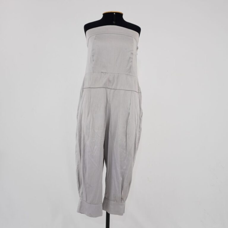 by Michelle Araujo Leia Mais...Macacão sem alça na cor cinza com listras verticais prateadas. Peça com recorte na cintura. 2 bolsos faca. 2 pregas frontais, 2 pregas traseiras. 4 pregas na barra...