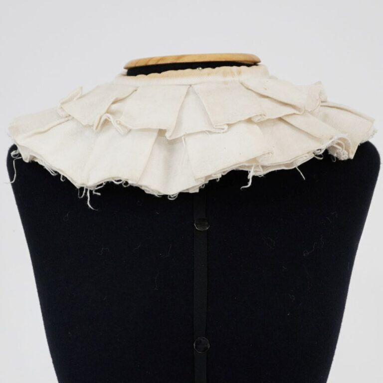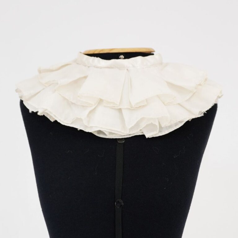 by Michelle Araujo Leia Mais...Gola pierrot com 5 camadas de tecido branco. Levemente transparente. Fechamento em velcro.