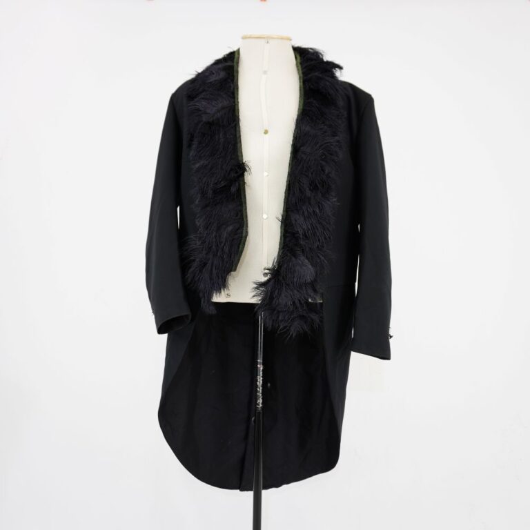 by Michelle Araujo Leia Mais...Fraque preto forrado com aplicação de aviamentos de penas pretas por todo o decote. 1 bolso na lateral esquerda e 1 bolso interno. 2 botões ornamentais nas costas.