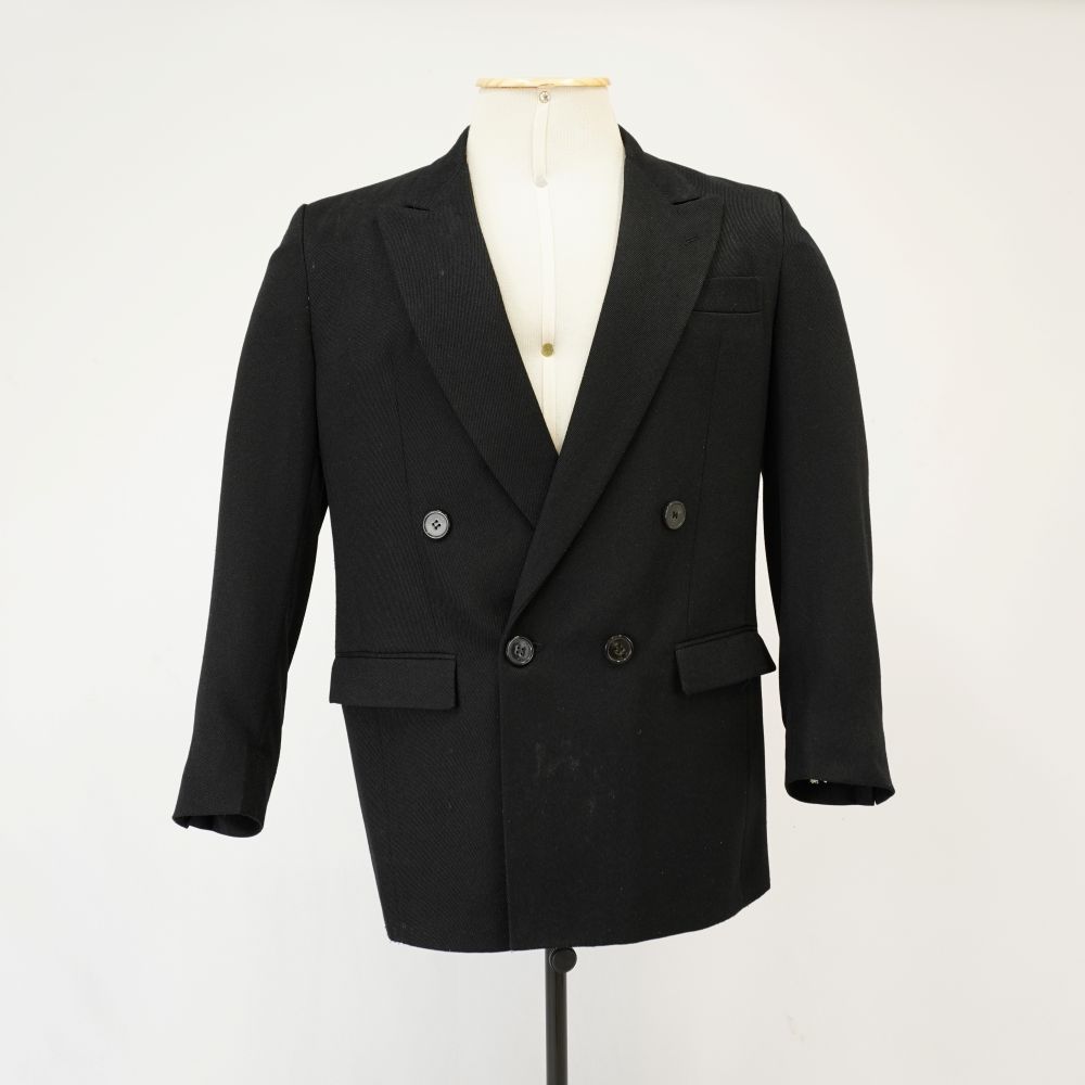 Terno de abotoamento duplo preto, três bolsos externos e quatro bolsos internos, quatro botões nos punhos, sendo dois de cada lado, com ombreira e semi forrado