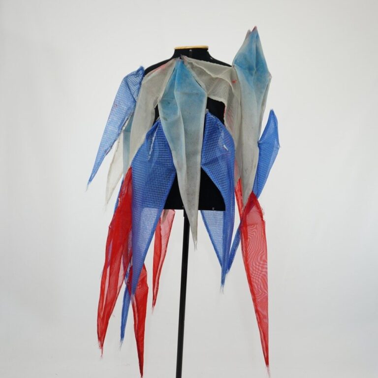 by Michelle Araujo Leia Mais...Parangolé feito de tela transparente nas cores branco, azul e vermelho, figurino composto por dezenas de elementos com a mesma forma ponteaguda costuradas uns aos outros, compondo um...
