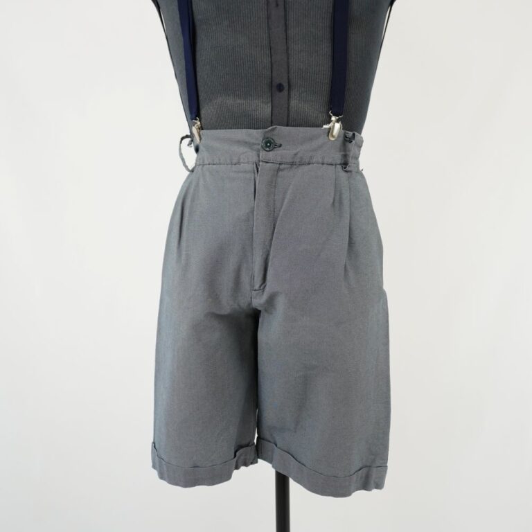 by Michelle Araujo Leia Mais...Bermuda cinza com suspensório azul escuro, bermuda com dois bolsos na frente, duas pregas frontais, fechamento em zíper de plástico e botão de plástico, suspensório azul escuro com...