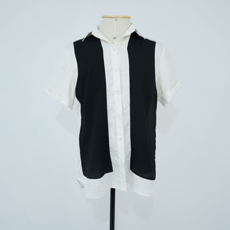 by Michelle Araujo Leia Mais...Camisa branca com os recortes da vista frontal e da pala das costas em tecido preto. Manga curta e fechamento em botões de plástico.