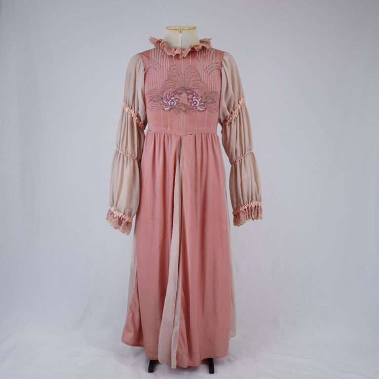 Vestido longo em malha acetinada rosa com nesgas na saia em musseline rosa claro. Mangas bufantes longas em musseline rosa claro com aplicação de fita de veludo e...