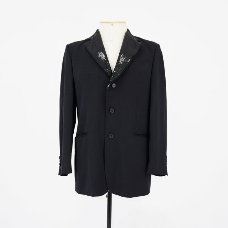 by Michelle Araujo Leia Mais...Fraque preto forrado. Lapela com paetê bordado preto, 6 botões de plástico frontais e 1 bolso no lado esquerdo superior, 2 botões nas costas e 3 botões decorativos...
