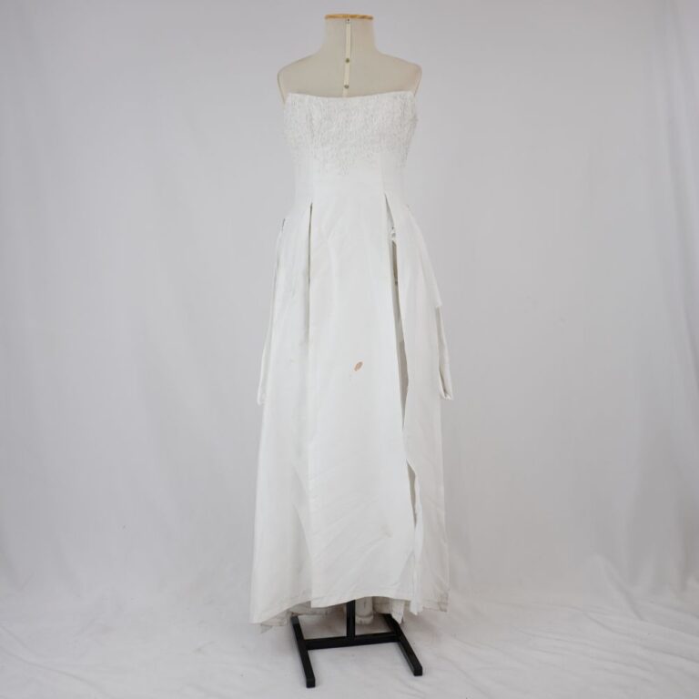by Michelle Araujo Leia Mais...Vestido de noiva branco sem alça, bordado no busto e na saia das costas, miçanga e vidrilho transparentes, com barbatana parte frontal da saia em painéis, faixas dobradas...