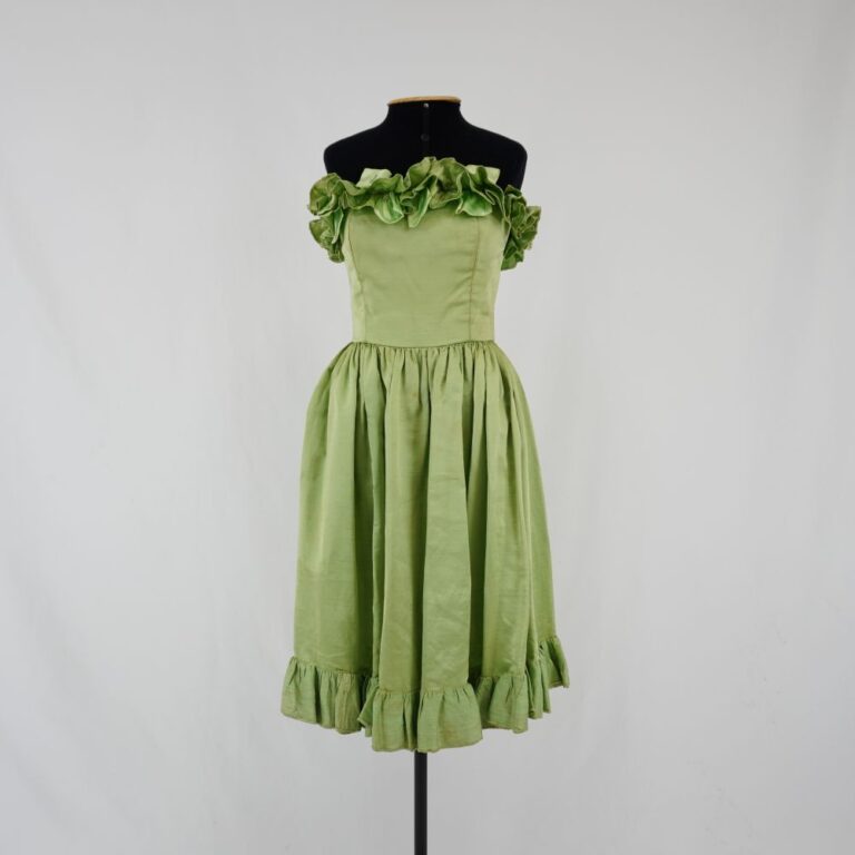 by Michelle Araujo Leia Mais...Vestido curto sem alça, verde claro, busto com barbatanas, saia com pregas, aplicação de babados com o mesmo tecido ao redor do decote e barra, no babado do...