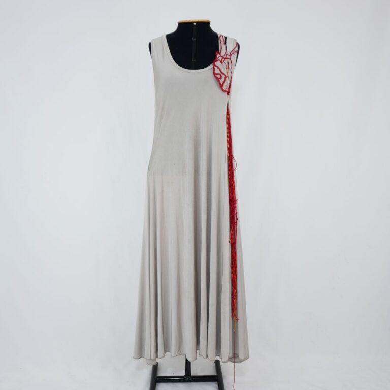 by Michelle Araujo Leia Mais...Vestido cinza sem manga de modelagem ampla com bordado de coração feito com fios vermelho, laranja e vinho. Prega fêmea logo abaixo do aplique fios pendentes abaixo do...