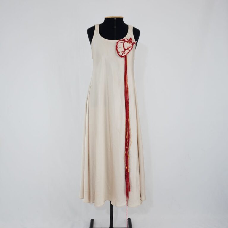 by Michelle Araujo Leia Mais...Vestido creme sem manga de modelagem ampla com bordado de coração feito com fios vermelho, laranja e vinho. Prega fêmea logo abaixo do aplique e nas costas. Fios...