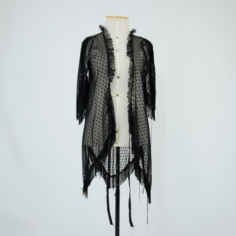 Blusa/penuar de tule de renda preta, de corações com franjas na manga e na barra, com frufru na frente