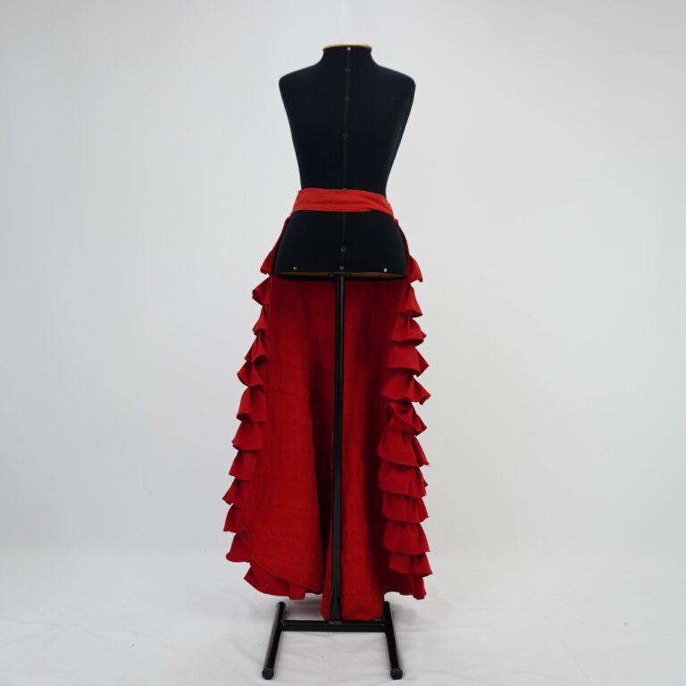 by Michelle Araujo Leia Mais...Saia só na parte traseira com cós largo vermelha, formada de 12 camadas de babados e fechamento em velcro