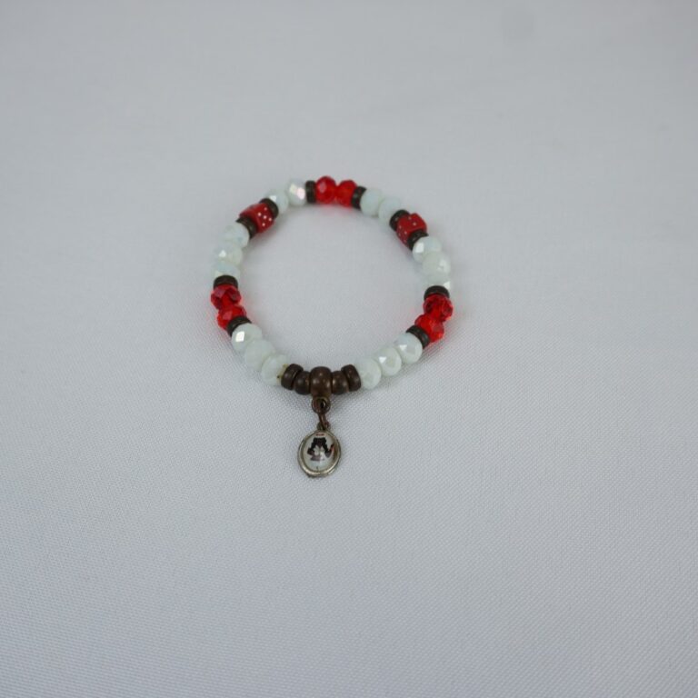 by Michelle Araujo Leia Mais...Pulseira de contas brilhantes vermelha, branca, preta e em forma de dados, com pingente de Pomba Gira