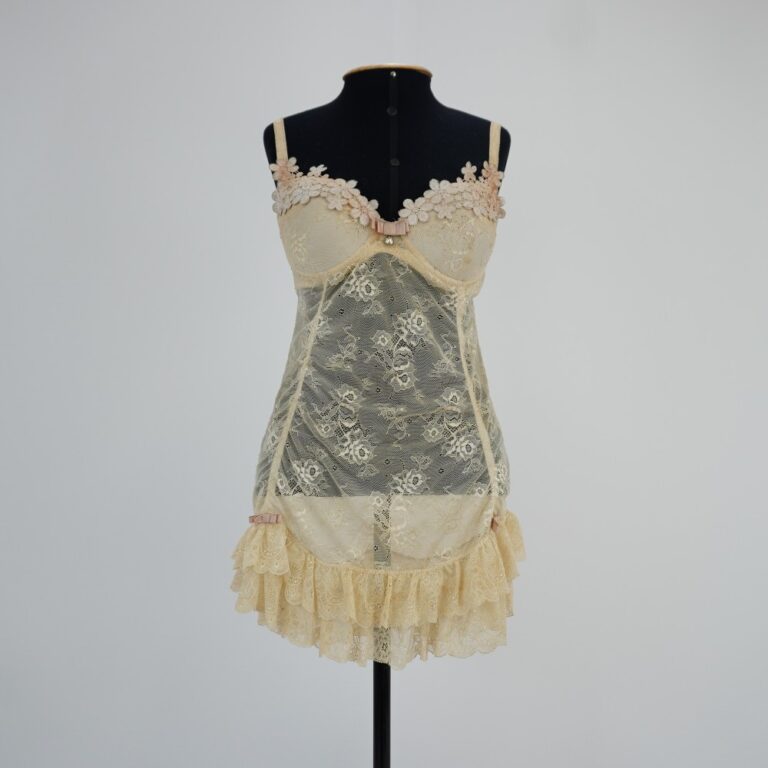 by Michelle Araujo Leia Mais...Babydoll de renda bege com sutiã de bojo. Aplicação de flores rendadas no decote com laço e pendente brilhante no meio, duas camadas de babado na barra e...