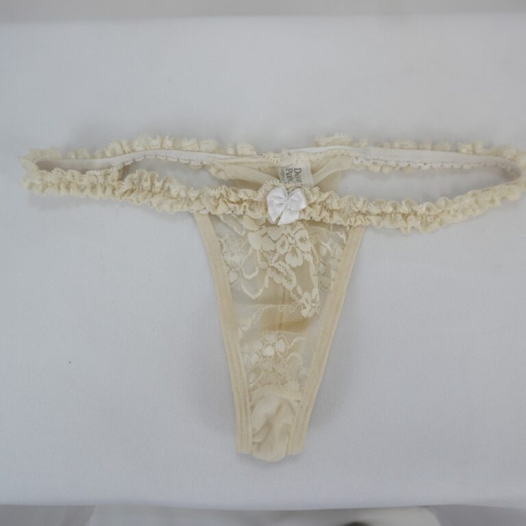 by Michelle Araujo Leia Mais...Calcinha de renda bege, fio dental, elástico atrás com froufrou de renda