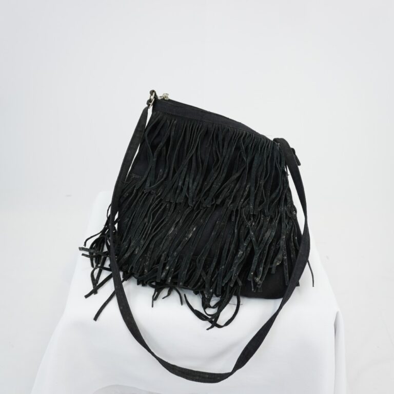 by Michelle Araujo Leia Mais...Bolsa de couro preta camurça, fechamento em ziper, três faixas de franjas de couro na parte frontal, alça longa com argola e ajuste em metal. Bolso embutido com...