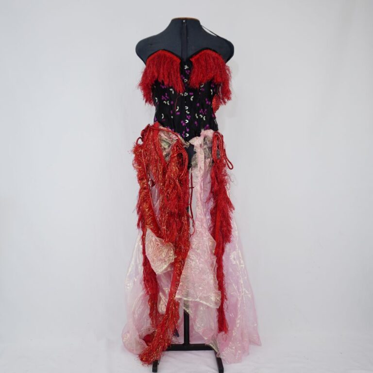 by Michelle Araujo Leia Mais...Corset preto com bordado roxo e verde, barbatanas, fechamento frontal em colchete de metal e ilhós com fita de cetim vermelha nas costas. Aplicação de tecido com transparência...