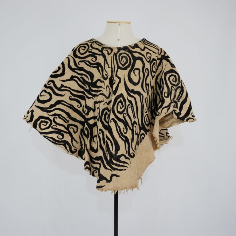 by Michelle Araujo Leia Mais...Poncho creme com estampa orgânica preta, barra a fio, viés preto na gola parte interna