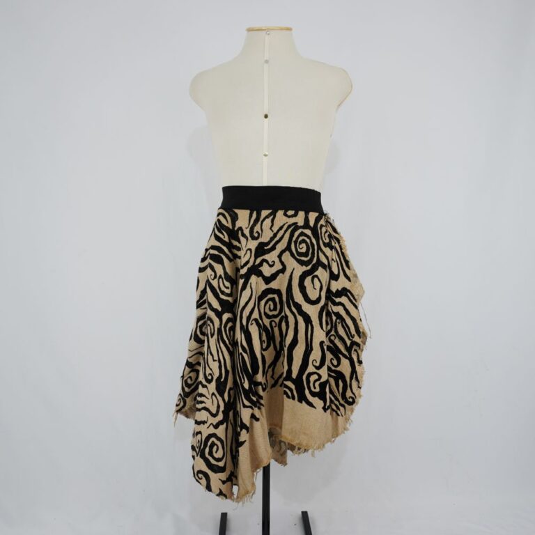 by Michelle Araujo Leia Mais...Saia godê curta creme com estampa orgânica preta, elástico no cós, uma das extremidades da barra está costurada na região do quadril, barra a fio