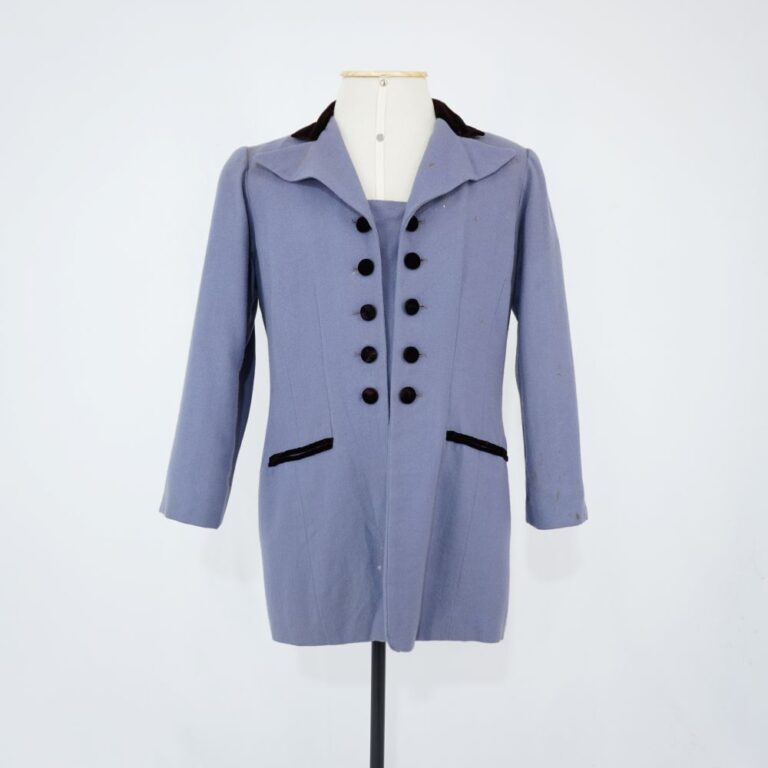 by Michelle Araujo Leia Mais...Paletó cinza azulado com vista dupla, gola, botões e abertura dos dois bolsos frontais falsos em veludo marrom. Fechamento com botão de pressão e botão caseado.