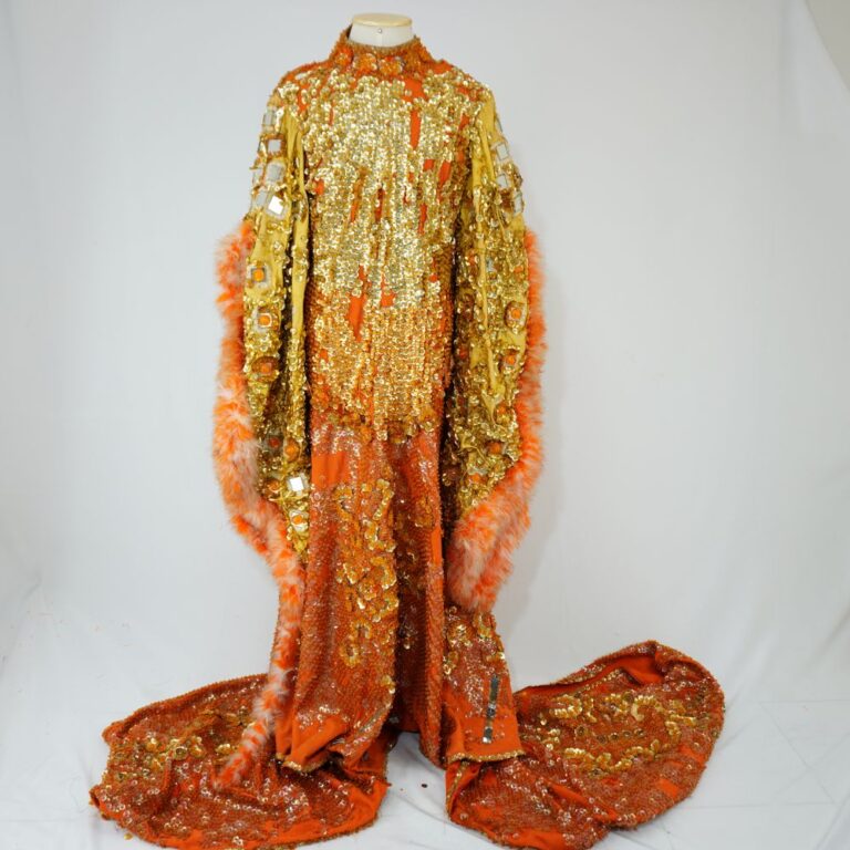 by Michelle Araujo Leia Mais...Vestido de paetê dourado de cauda longa. Todo bordado a mão com paetês de diferentes tamanhos dourados grandes e furta cor transparente. Apliques de espelhos (3) com elementos...