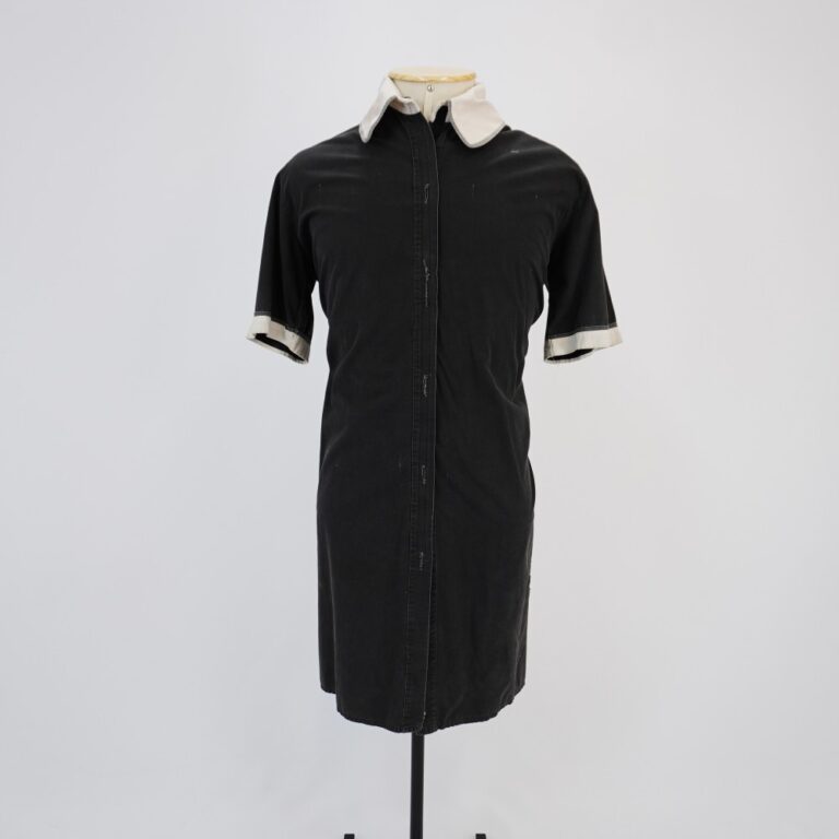 by Michelle Araujo Leia Mais...Vestido tipo chemise midi preto, com manga curta, detalhes na barra da manga e na gola de gorgurão branco. Fechamento original em botões, mas foi substituído por fechamento...