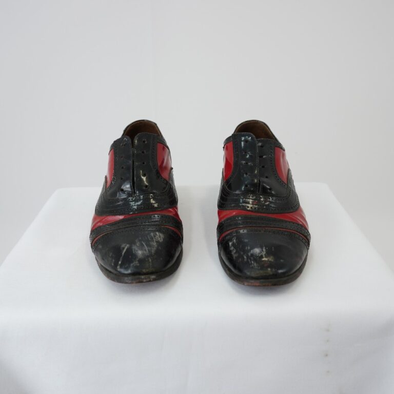 Sapato social de amarração em couro bicolor nas cores preto e vermelho. Acabamento envernizado salto médio
