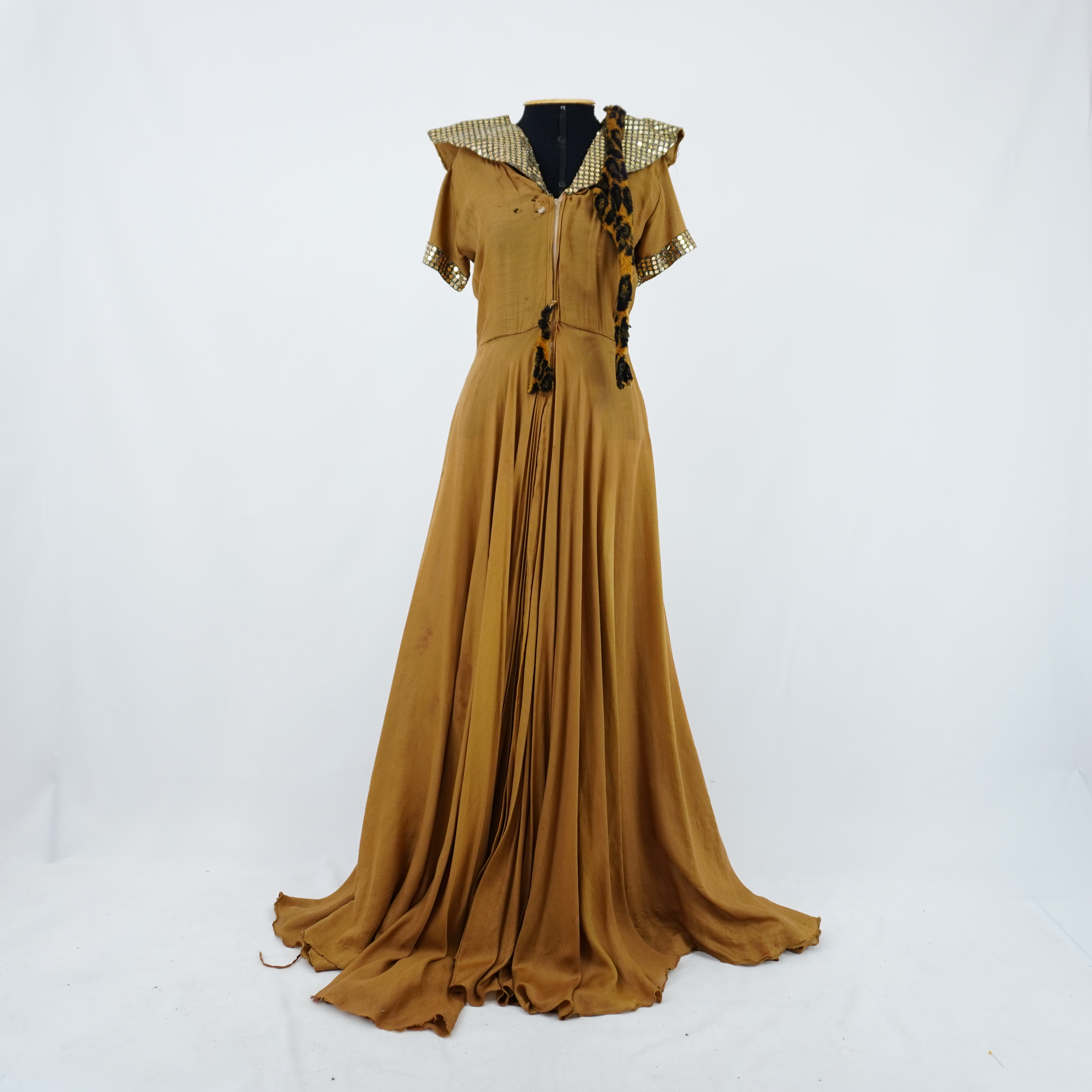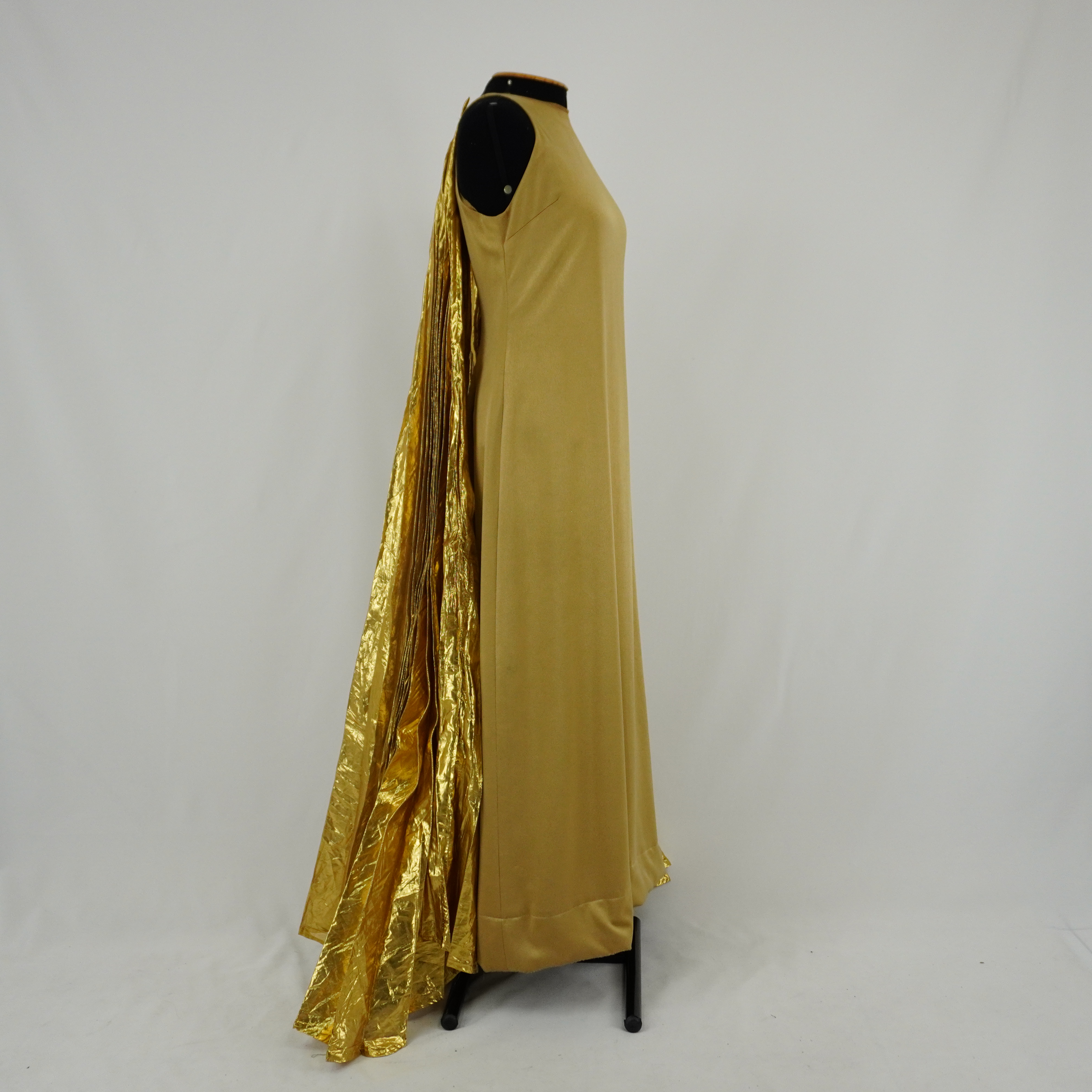 Vestido longo evasê de tecido ocre dourado com brilhos de purpurina. Atrás aplicada capa dourada plissada e brilhante.