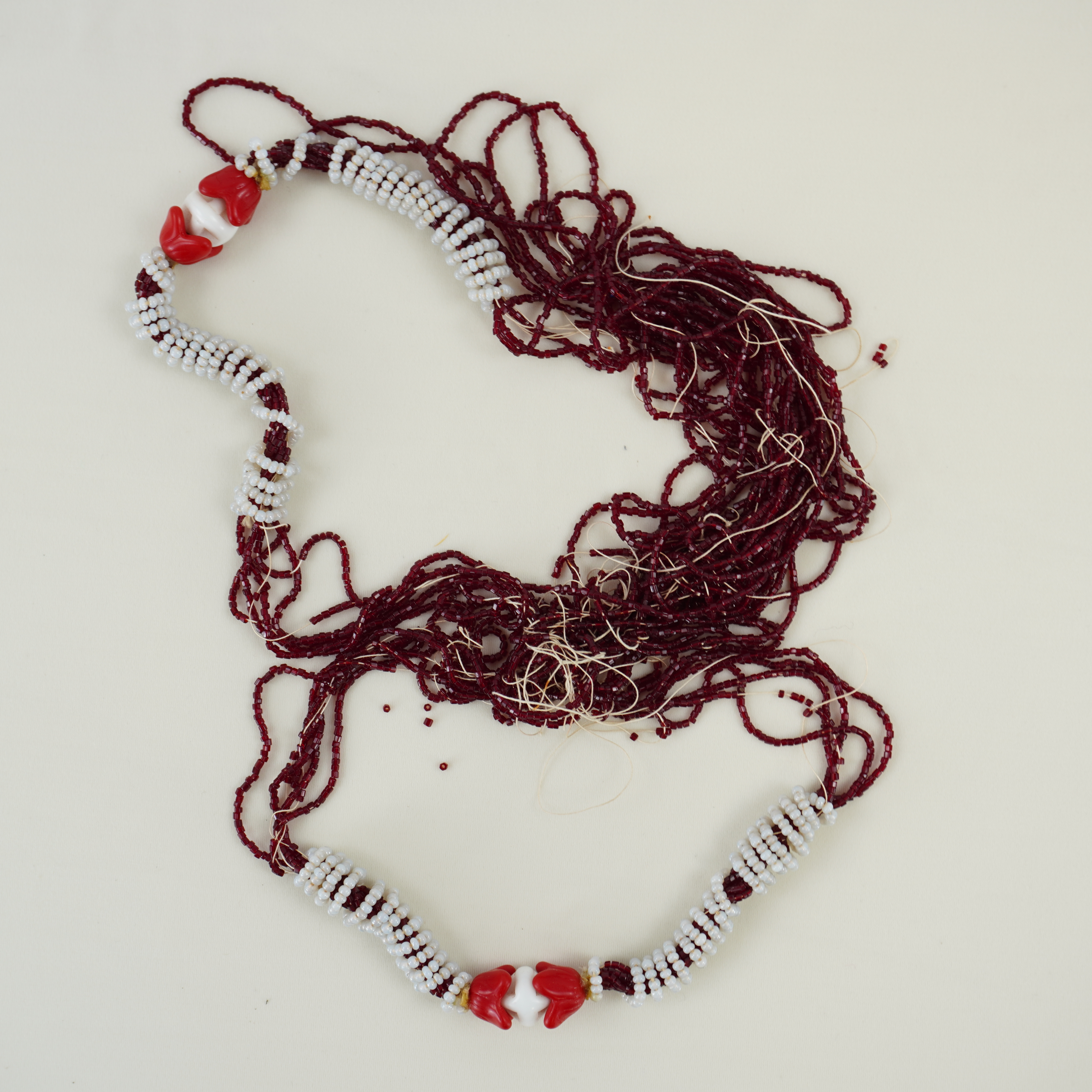 setembro 21, 2025 by Michelle Araujo Leia Mais...Colar de miçangas de plástico branca com canutilho vinho e aviamentos de plástico branco e vermelho, fio de tecido