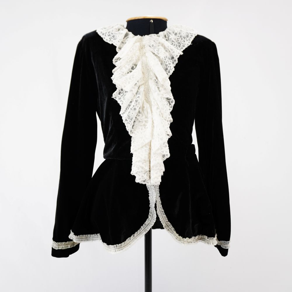 by Michelle Araujo Leia Mais...Casaco de veludo preto forrado, um bolso na lateral externa inferior esquerda. Gola tipo jabô em renda branca, fita pregueada branca aplicada nos punhos, na barra e na...