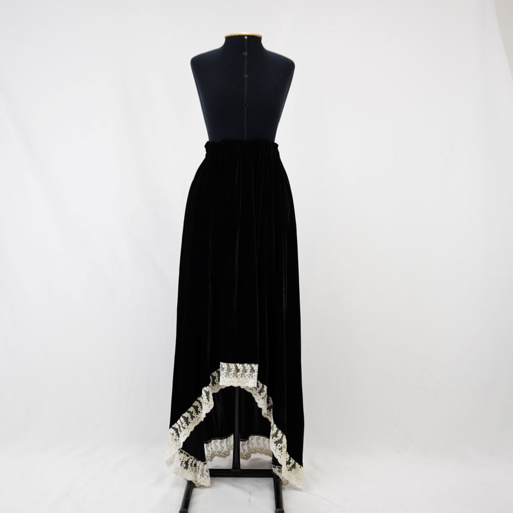 by Michelle Araujo Leia Mais...Saia de veludo preta com comprimento abaixo dos joelhos e parte traseira mais comprida. Aplicação de tule rendado branco ao redor de toda barra e elástico na cintura.