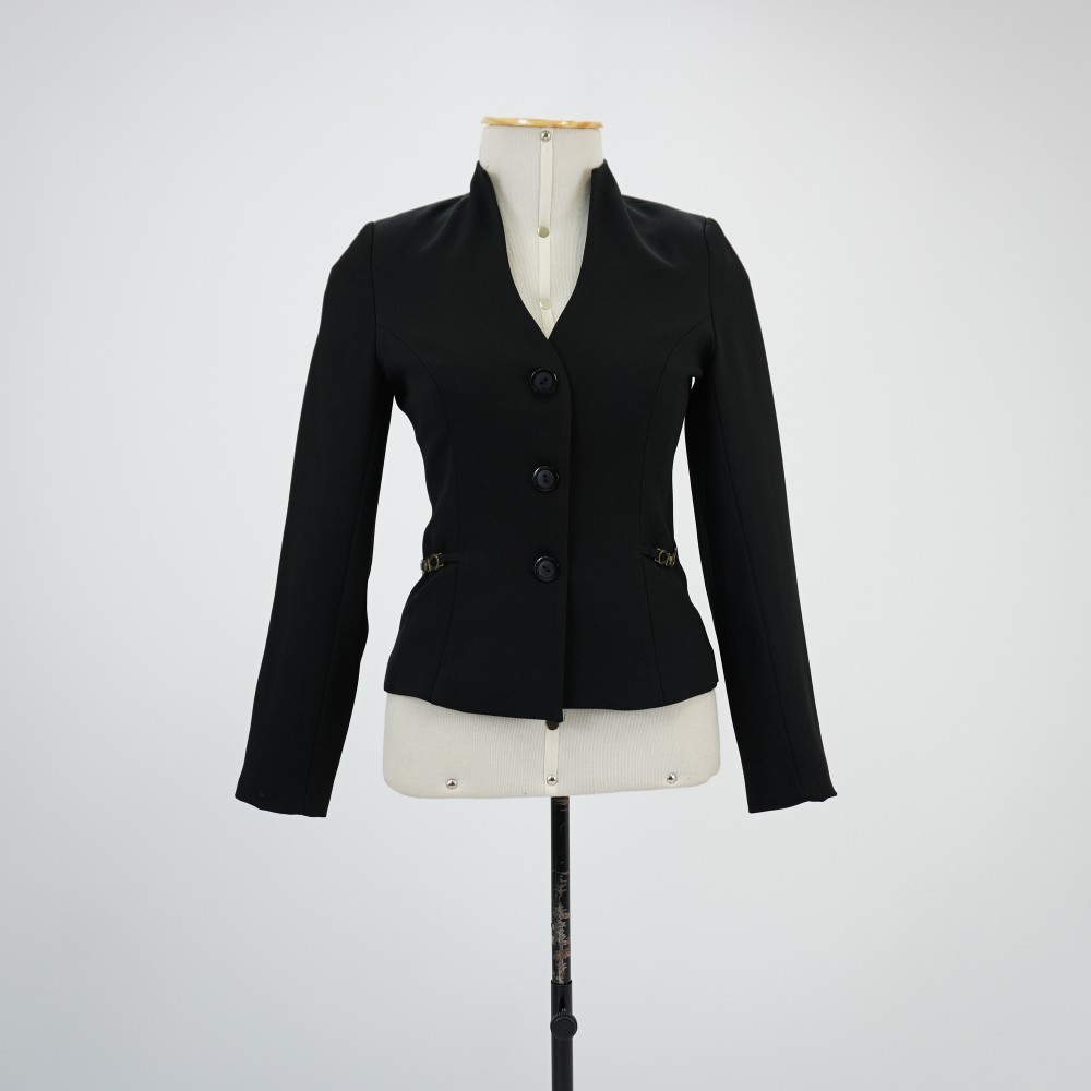 by catalogacao Leia Mais...Blazer gola alta preto acinturado com 2 apliques laterais e aviamento metálico. Com ombreiras embutidas e forro preto. Fechamento frontal em 3 botões pretos.
