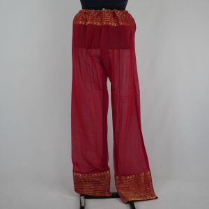 agosto 15, 2025 by Michelle Araujo Leia Mais...Calça vermelha com tecido jacquard em vermelho e dourado, com ajuste de viés na cintura.