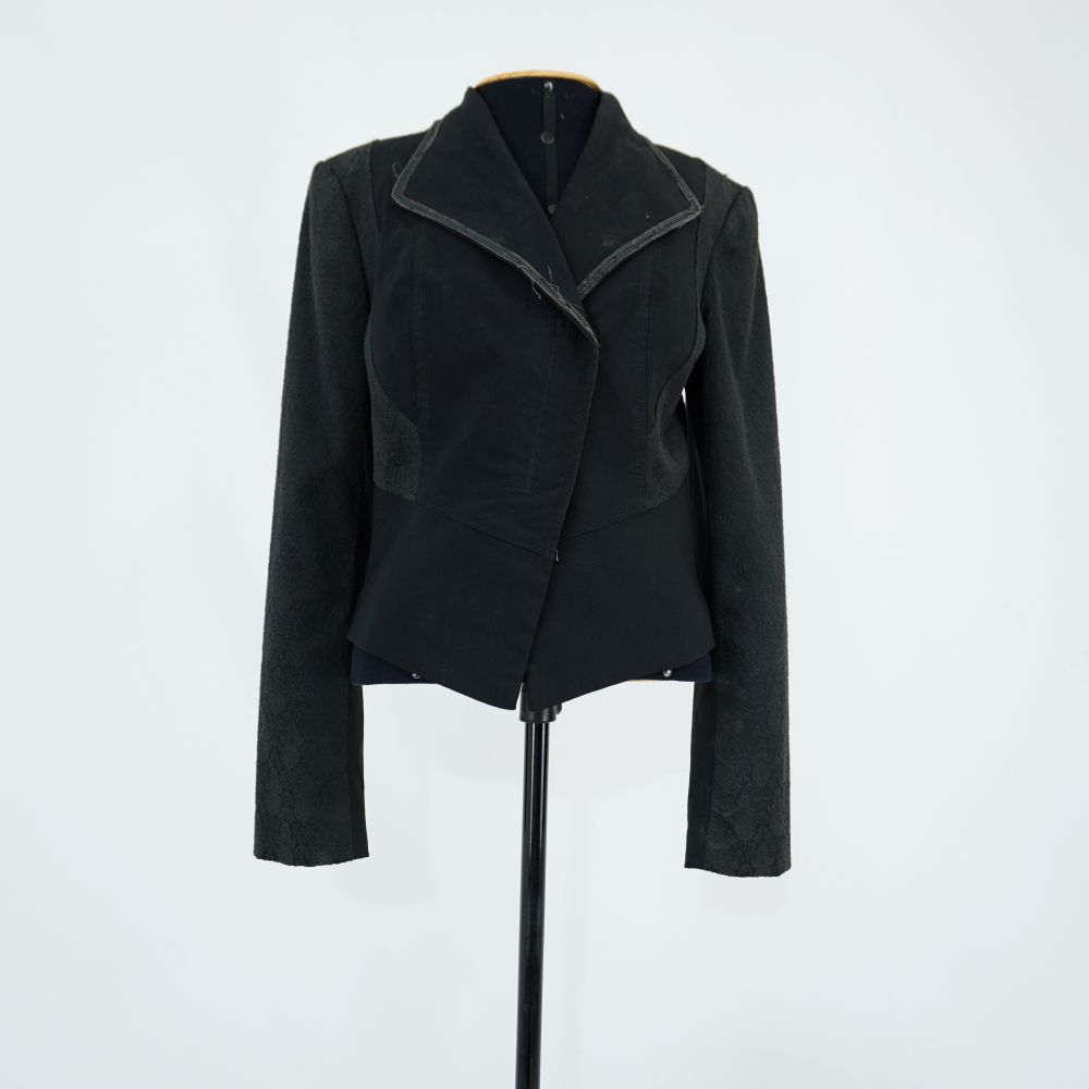 by Michelle Araujo Leia Mais...Jaqueta preta curta acinturada feita em dois tecidos. Parte frontal e barra: preto liso. Manga, laterais e costas: tecido jackard preto. Fechamento em zíper e dois colchetes. Aplicação...