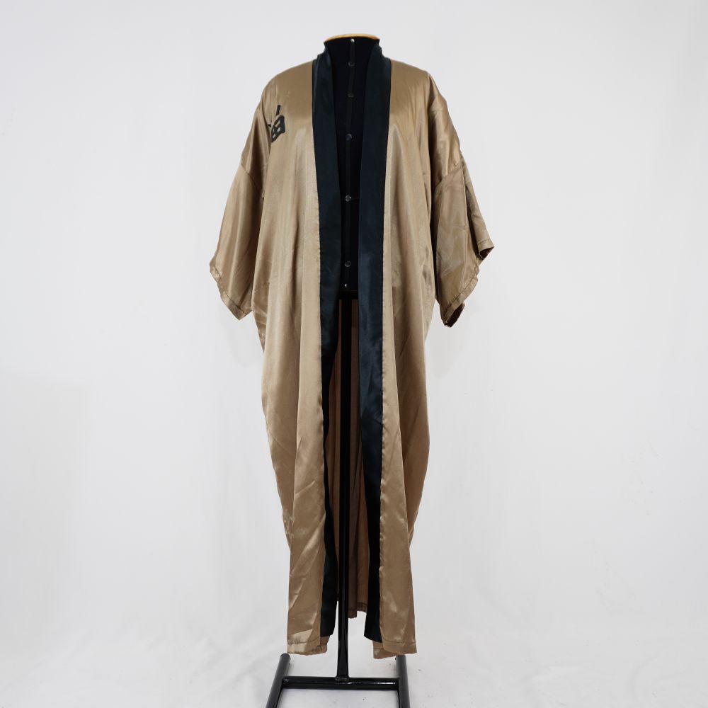 by Michelle Araujo Leia Mais...Kimono longo em tecido acetinado bege com faixa decote/pescoço até a barra preto. Manga curta e estampa localizada na frente direita e nas costas de caractere chinês na...