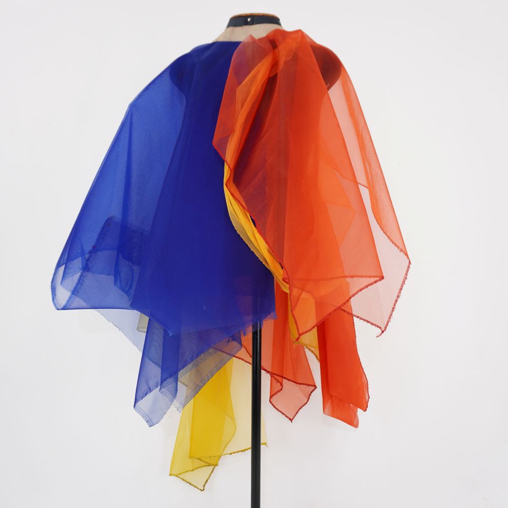 by Michelle Araujo Leia Mais...Parangolé de tela estruturada em azul, amarelo e vermelho. Tiras em amarelo e vermelho. Decote em elástico.