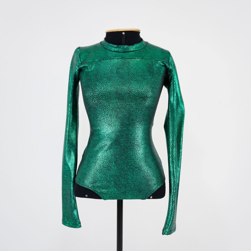 by Michelle Araujo Leia Mais...Body de manga longa com acabamento verde metalizado com textura reptiliana. Recorte no toráx, gola média e fechamento por zíper no centro costas.