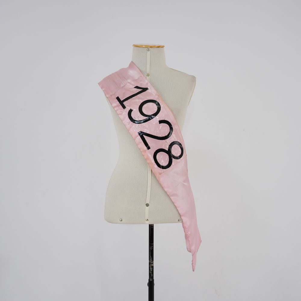 by Michelle Araujo Leia Mais...Faixa rosa retangular com adesivo “1928” em preto colado