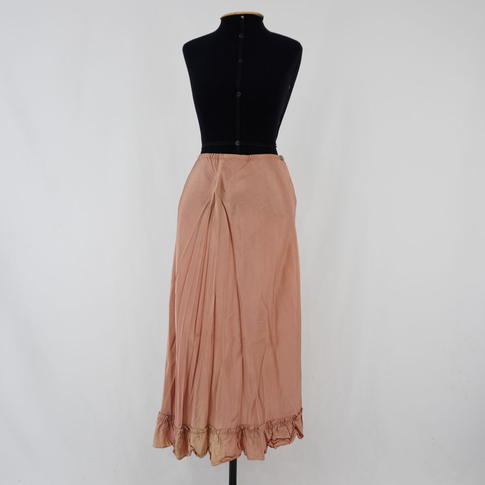 by Michelle Araujo Leia Mais...Saia midi rosê, godê, com babados no mesmo tecido aplicados na barra, elástico no cós e botão de madrepérola