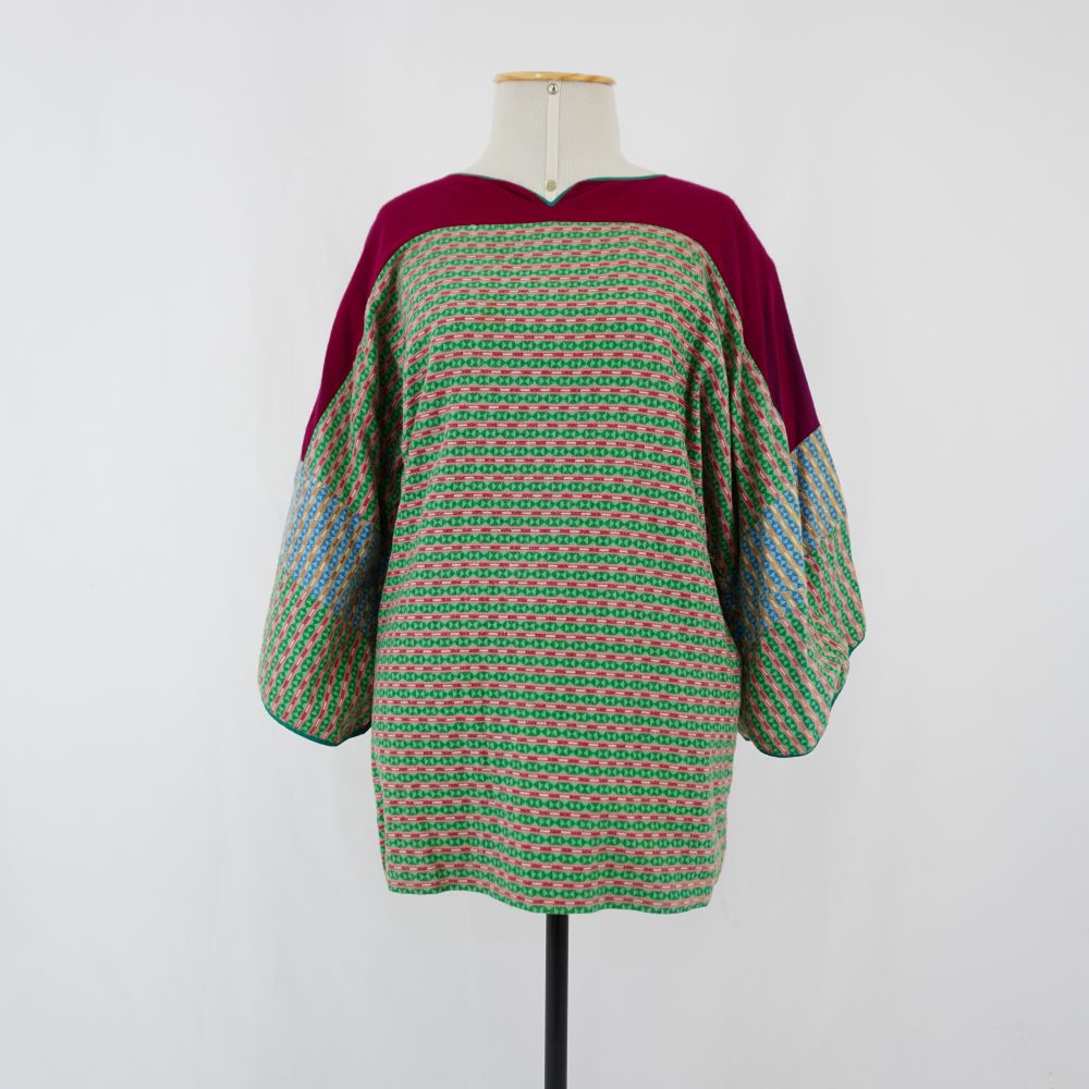 by Michelle Araujo Leia Mais...Blusa manga curta modelagem de quimono, decote e ombros com recorte cor magenta, manga com recorte de tecido estampa geométrica azul, mostarda, rosa e verde, mesmo do corpo....