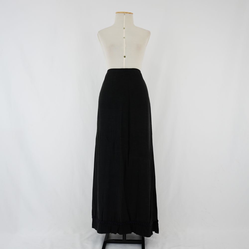 by Michelle Araujo Leia Mais...Saia reta longa preta com aplicação de fita decorativa preta próxima à barra com pregueado, forro preto, fenda na lateral esquerda, fechamento em zíper de metal nas costas