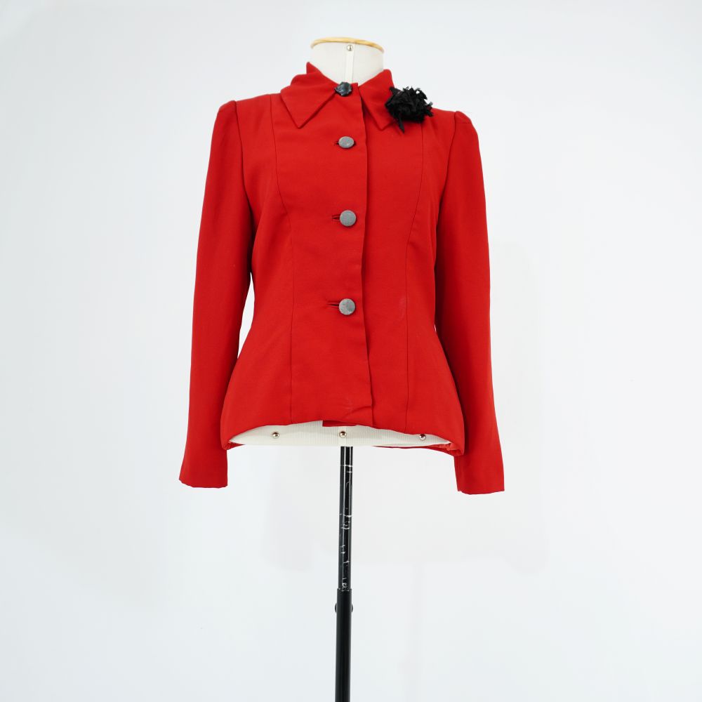 Blazer acinturado vermelho com ombreiras e forro acetinado vermelho, fechamento com quatro botões encapados, aplique na gola de uma flor de tecido preto