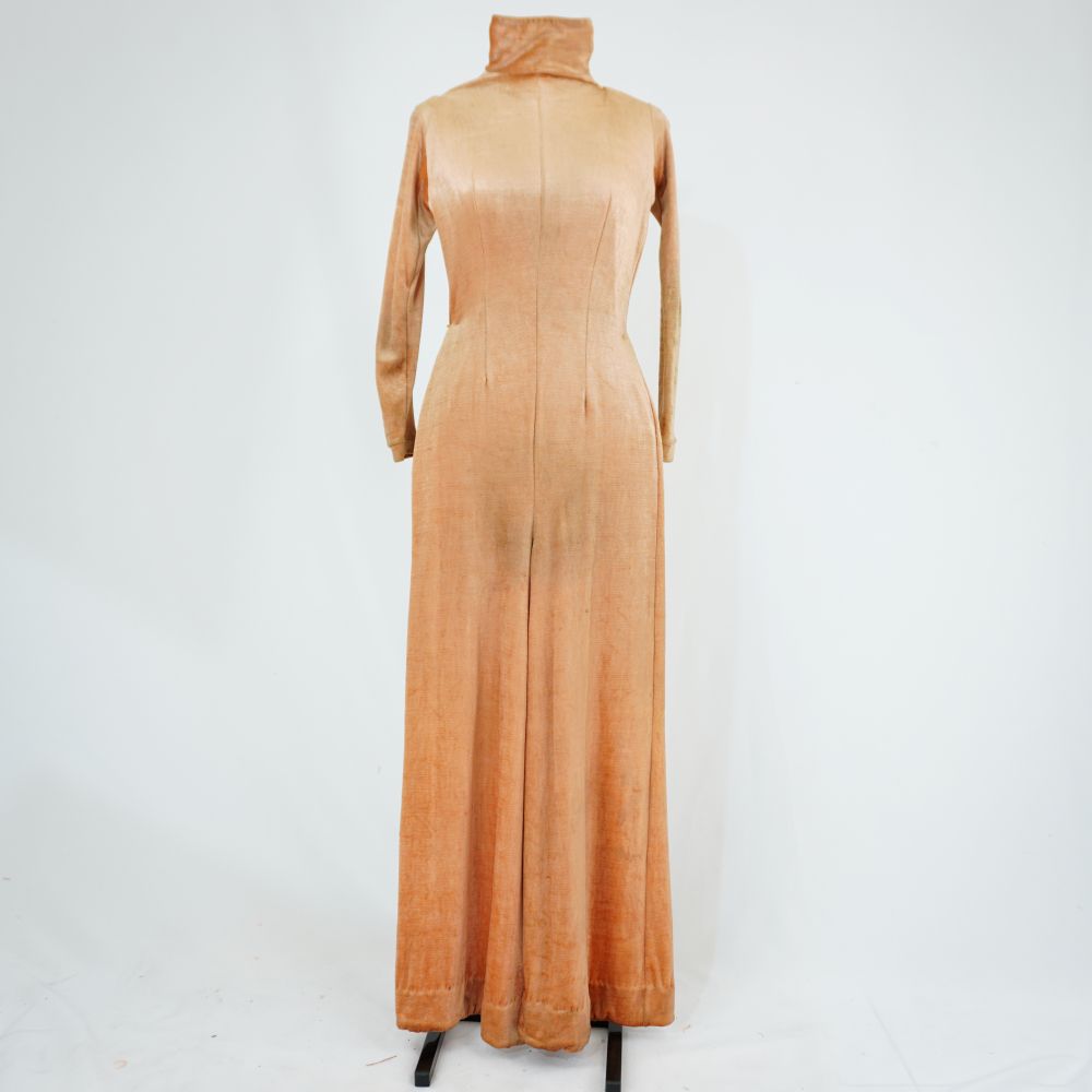 by Michelle Araujo Leia Mais...Macacão caramelo, manga longa, calça boca de sino, gola alto, abertura em zíper frontal